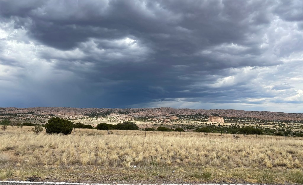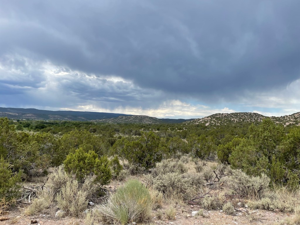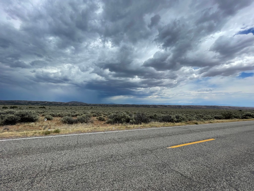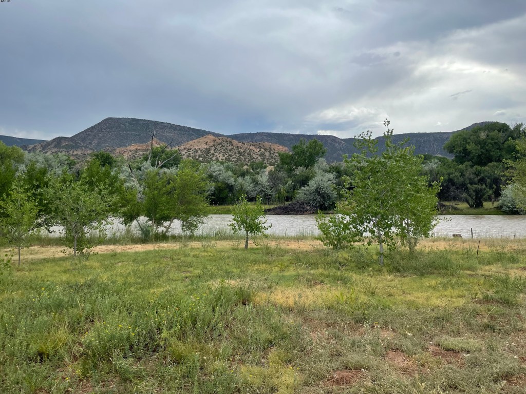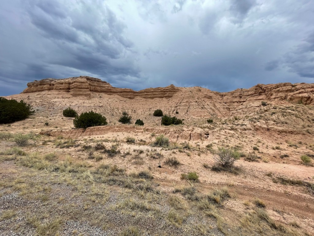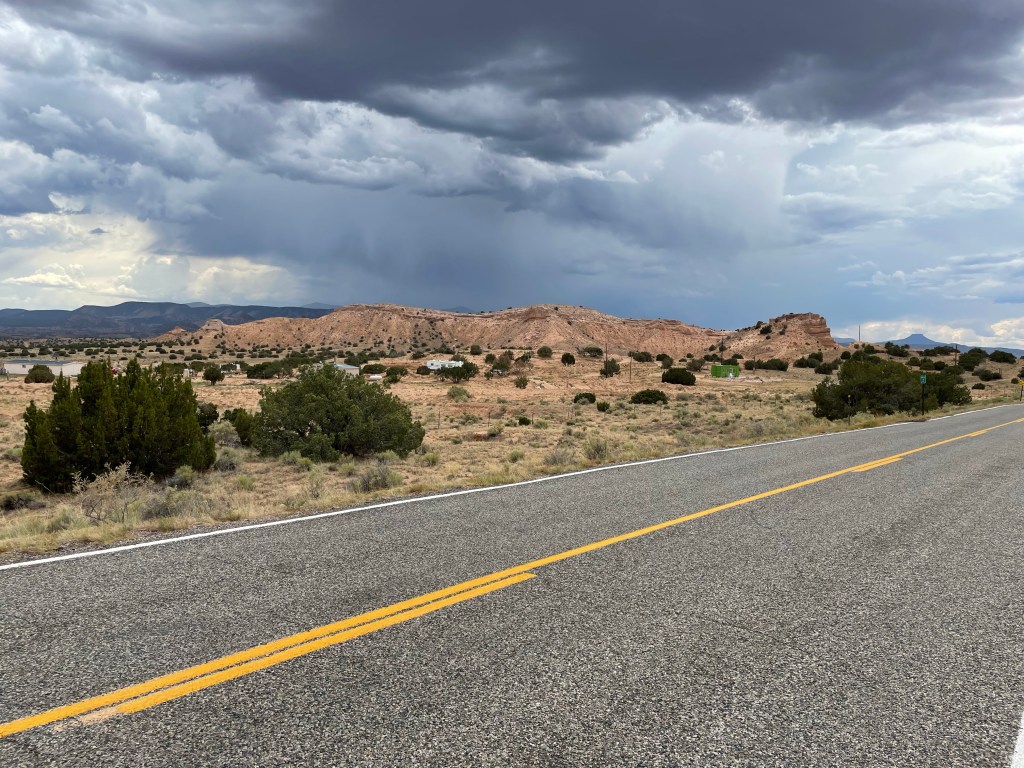 The rain lightened up just as I was getting closer to the springs, so I quickly filled my bottles and hurried to the campsite. Once at the campsite, I had a feeling that being in a nice storm would be no fun in this open area. I looked at my ACA app and saw Abiquiu was only 22 miles down the road and it would be a descent all the way there. Sold, let’s get on it before the rain starts again.