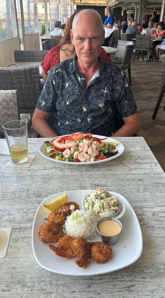 Folker and I treated ourselves to a proper seafood dinner last night that was super delicious. Folker got a preview of what is to come in Maine by having a Maine Lobster Salad and I decided to go with the trusty Coconut Shrimp. We got our taste buds warmed up before the main dishes with a half dozen raw oysters. Beautiful evening eating while watching some beach volleyball and listening to the life guard blow his whistle at overzealous swimmers pushing the limits in a red flag ocean.