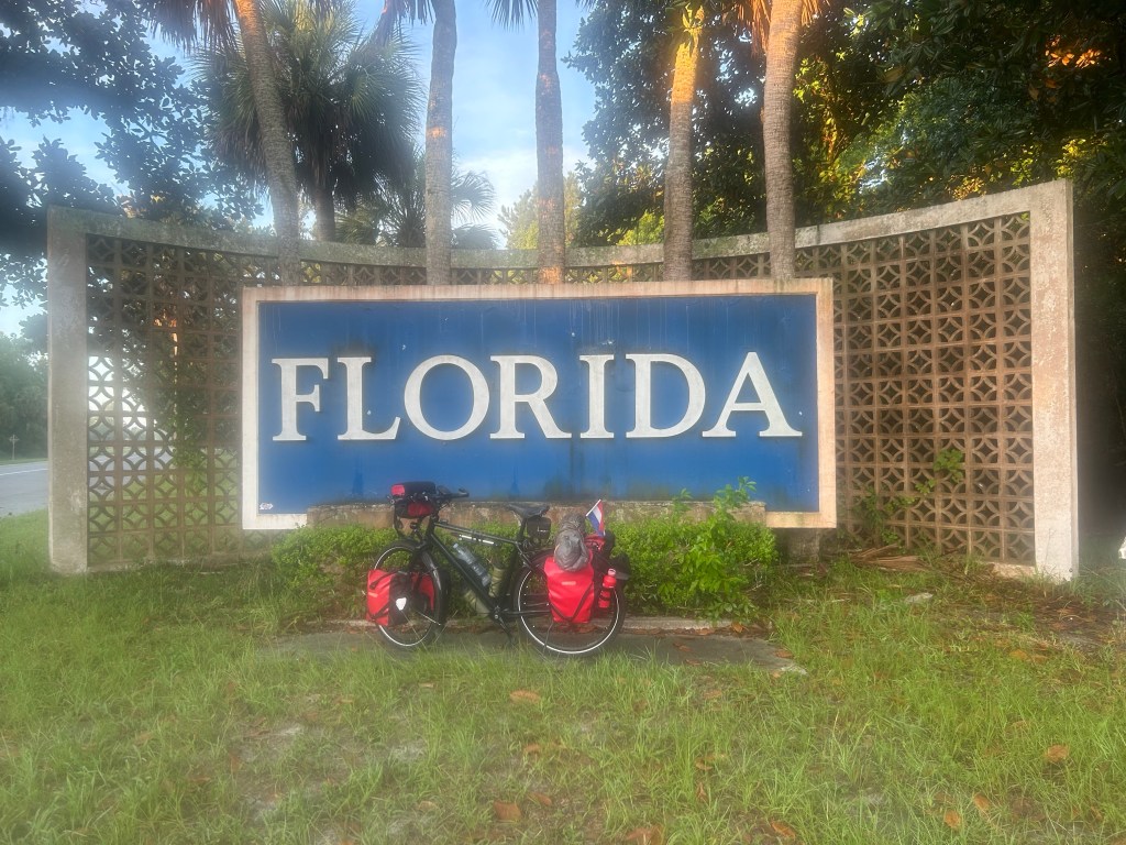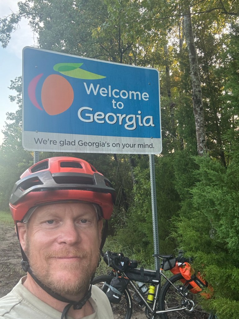 Twenty-five miles in and across the bridge we rode from the state known for their oranges to the peach state. Folker enjoyed Florida so much he crossed the street to get a photo of the welcome sign.