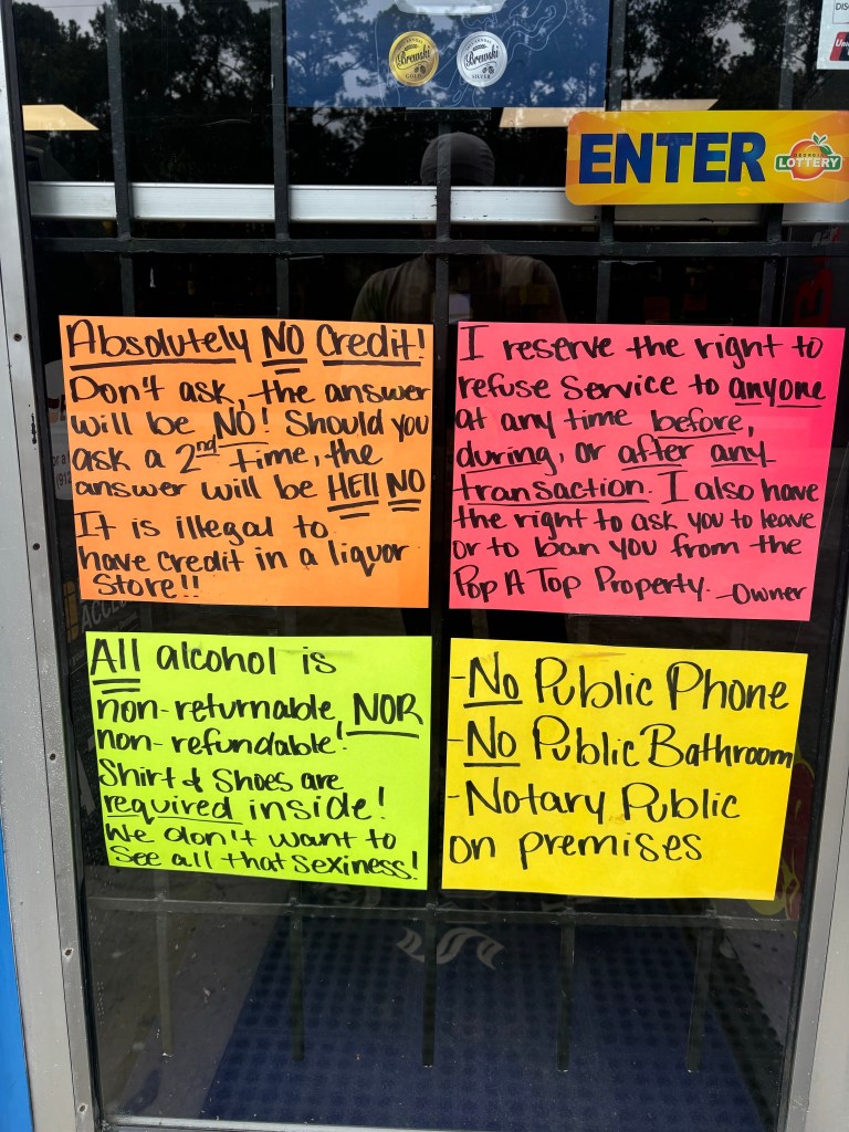 Closer to our destination we needed something cool and refreshing to drink and stopped at a store that was actually just a liquor store. Not sure how we missed all the obvious signs. They had some serious rules that needed to be highlighted prior to entry. I did find some great pineapple juice inside!