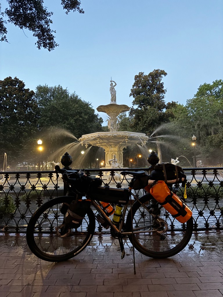 We rolled through the city easily while throughly enjoying all the unique architecture with the Spanish moss draping just above our heads it seemed. Forsyth Park was a very pleasant place to be when the city was almost void of other humans. Just a couple early bird runners and me happily pushing my bike through the pedestrian only sections.