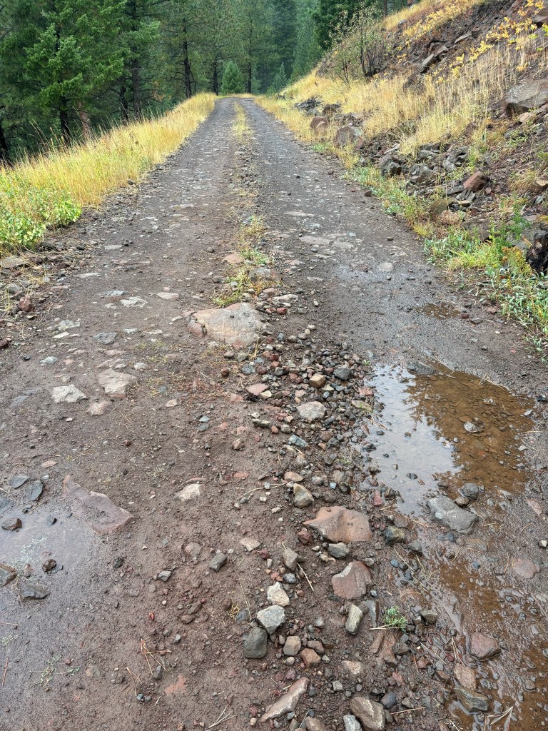 How did this come to be? Why did Cycle Oregon throw such a small population of cyclists this bone? When the man that finds the gravel routes took a look at this route, it had about four inches of snow covering it making it impossible to actually see the conditions of the road. The plans were made and routes were soon established. The other day when they took another look at this segment, they realized this route is filled with larger rocks and small boulders. They found out then that after a fire had swept through the area in the past, these large rocks were put in place to help support the large pieces of fire fighting equipment. Lucky me!
